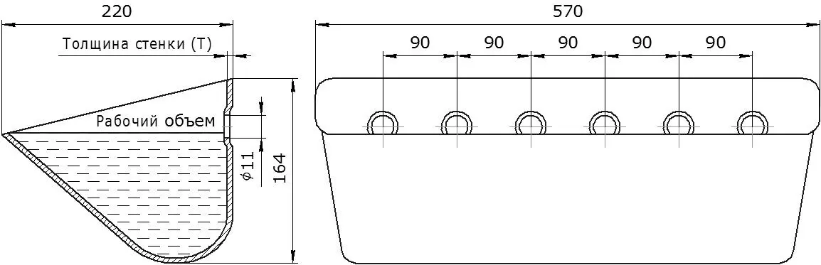 Из черной, оцинкованной или нержавеющей стали. Размеры: 570x220x164 мм