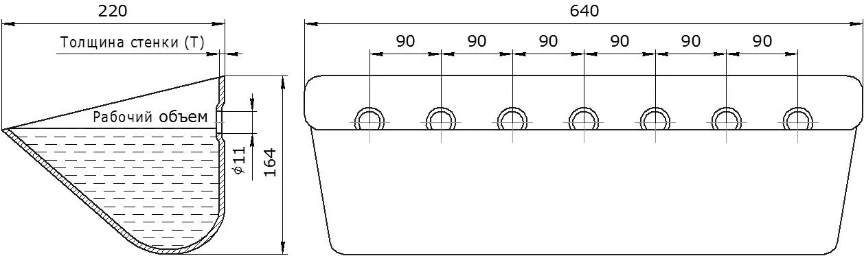 Из черной, оцинкованной или нержавеющей стали. Размеры: 640x220x164 мм