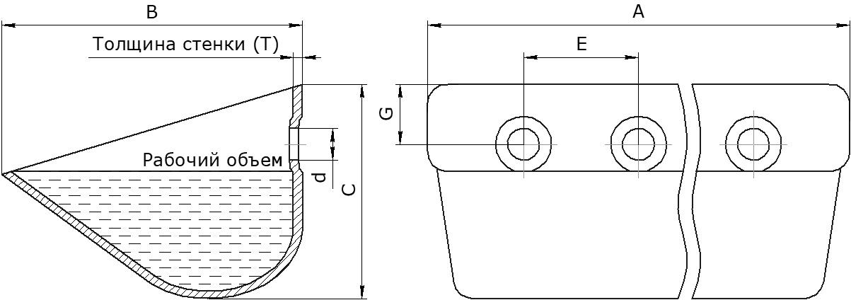 | Марка | Ширина (А), мм | Вылет (В), мм | Высота (C), мм | Рабочий объем, л | Отверстия | Кол-во/метр, шт. | Вес, кг | |||||